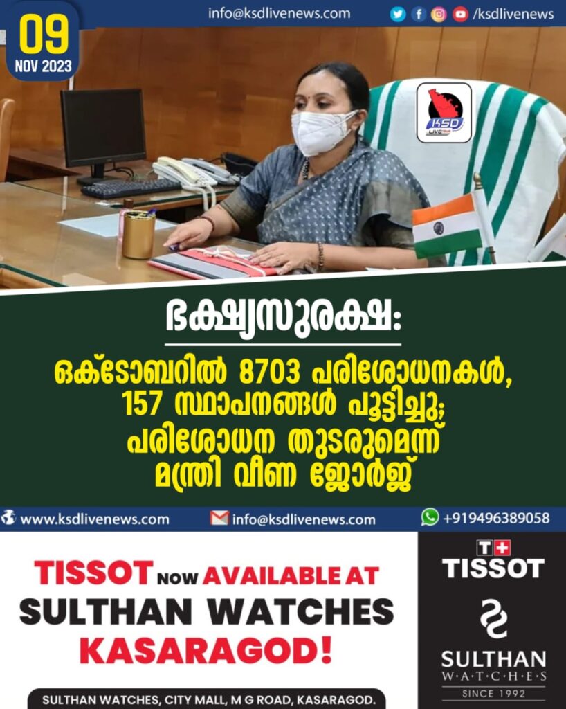 ഭക്ഷ്യസുരക്ഷ: ഒക്‌ടോബറിൽ 8703 പരിശോധനകള്‍, 157 സ്ഥാപനങ്ങള്‍ പൂട്ടിച്ചു, 33 ലക്ഷം പിഴ ഈടാക്കി