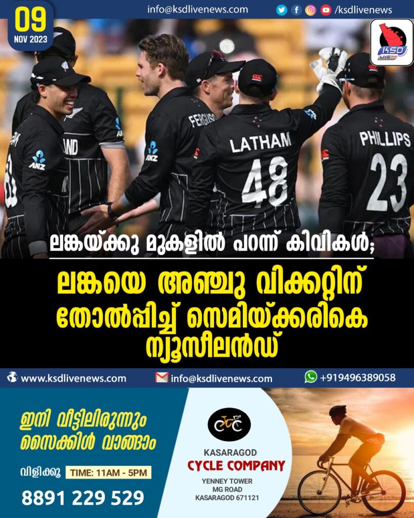 ലങ്കയ്ക്കു മുകളിൽ പറന്ന് കിവികൾ; ലങ്കയെ അഞ്ചു വിക്കറ്റിന് തോൽപ്പിച്ച് സെമിയ്ക്കരികെ ന്യൂസീലൻഡ്