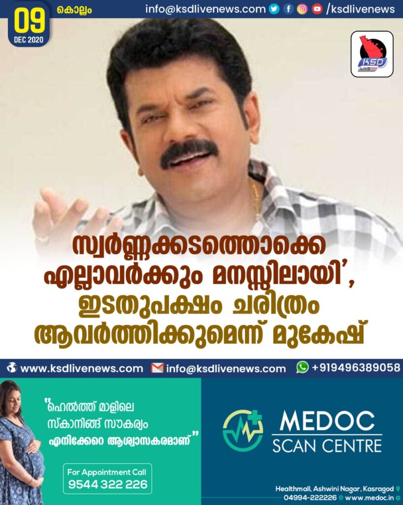 സ്വർണ്ണക്കടത്തൊക്കെ എല്ലാവർക്കും മനസ്സിലായി’, ഇടതുപക്ഷം ചരിത്രം ആവർത്തിക്കുമെന്ന് മുകേഷ്