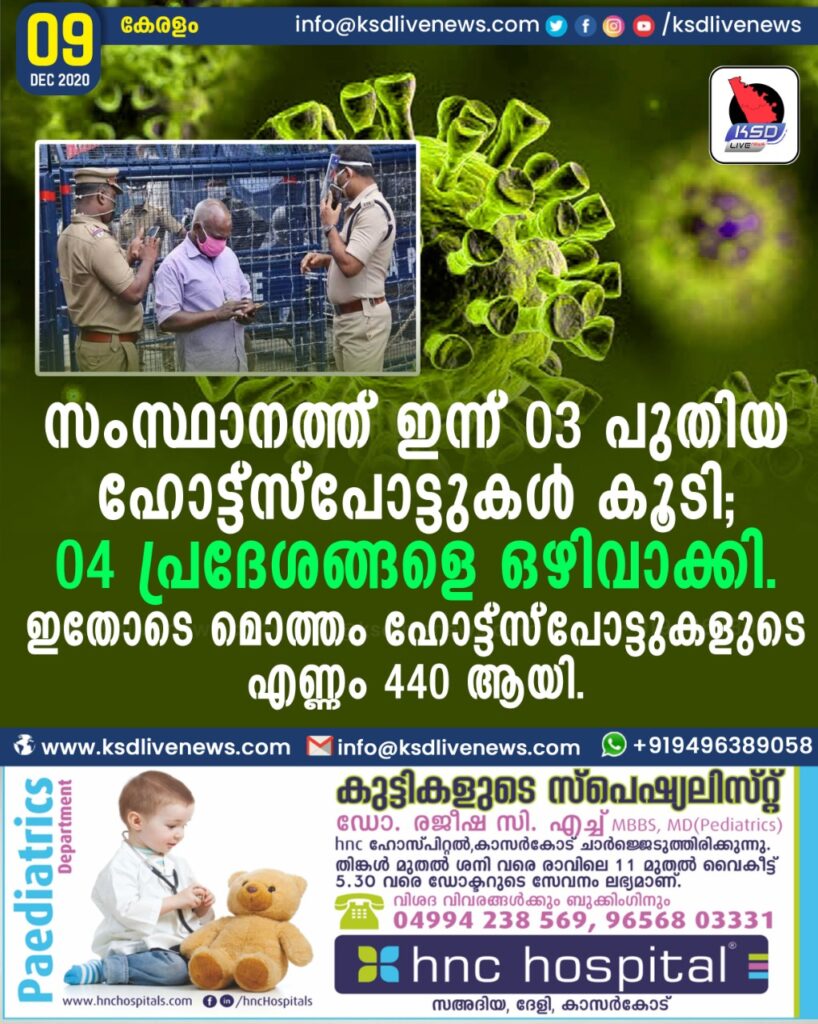 സംസ്ഥാനത്ത് ഇന്ന് 03 പുതിയ ഹോട്ട്സ്പോട്ടുകള് കൂടി; 04 പ്രദേശങ്ങളെ ഒഴിവാക്കി. ഇതോടെ മൊത്തം ഹോട്ട്സ്പോട്ടുകളുടെ എണ്ണം 440 ആയി.