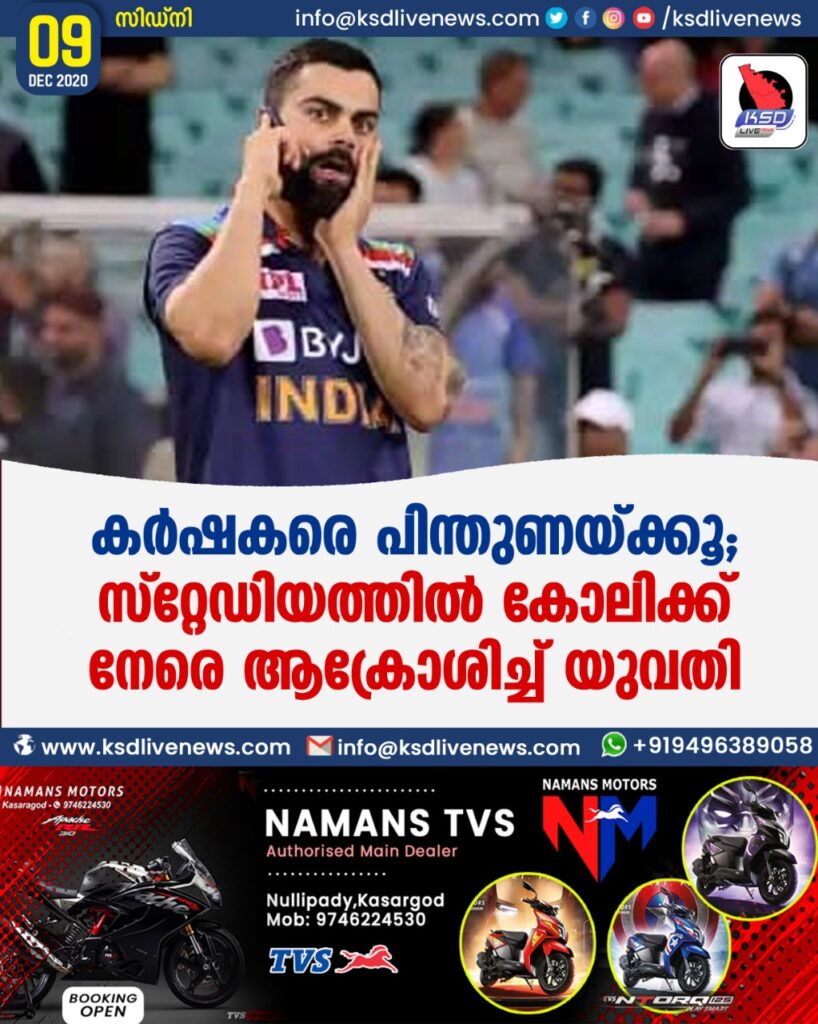 സിഡ്നി: കേന്ദ്ര സർക്കാരിന്റെ പുതിയ കാർഷിക നിയമം പിൻവലിക്കണമെന്നാവശ്യപ്പെട്ട് സമരം ചെയ്യുന്ന കർഷകർക്ക് പിന്തുണ നൽകണമെന്ന് ഇന്ത്യൻ ക്രിക്കറ്റ് ടീം ക്യാപ്റ്റൻ വിരാട് കോലിയോട് ആക്രോശിച്ച് യുവതി.