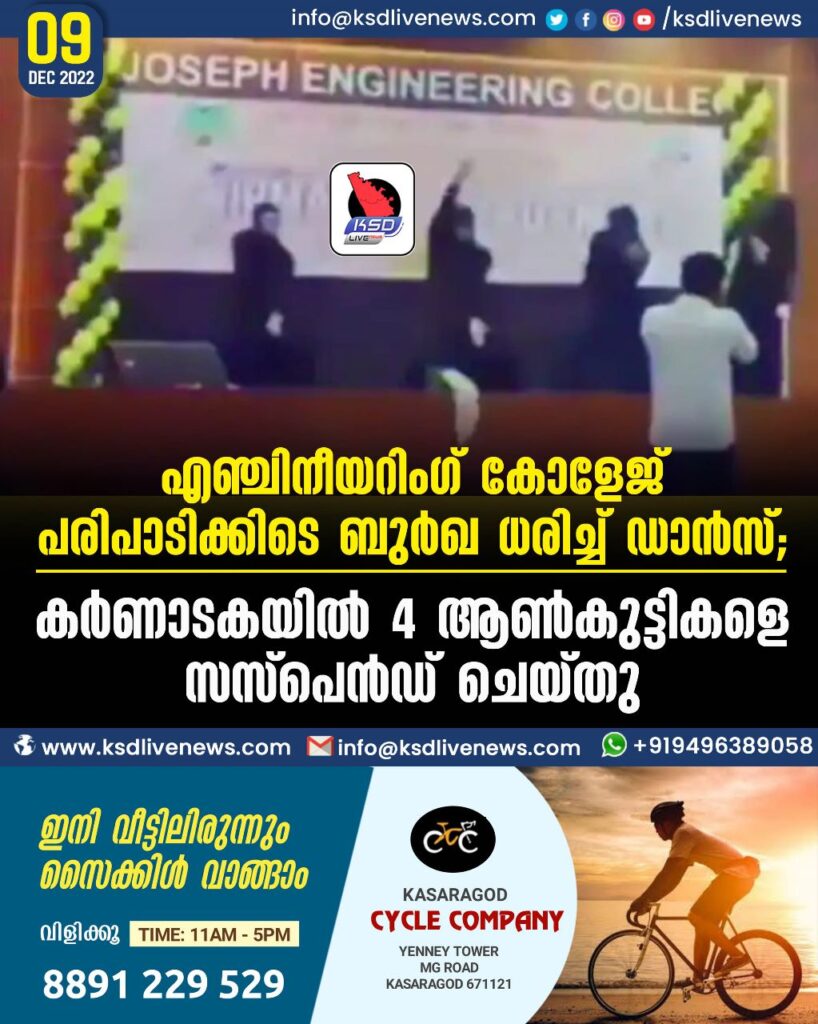 എഞ്ചിനീയറിംഗ് കോളേജ് പരിപാടിക്കിടെ ബുർഖ ധരിച്ച് ഡാൻസ്; കർണാടകയിൽ 4 ആൺകുട്ടികളെ സസ്പെൻഡ് ചെയ്തു