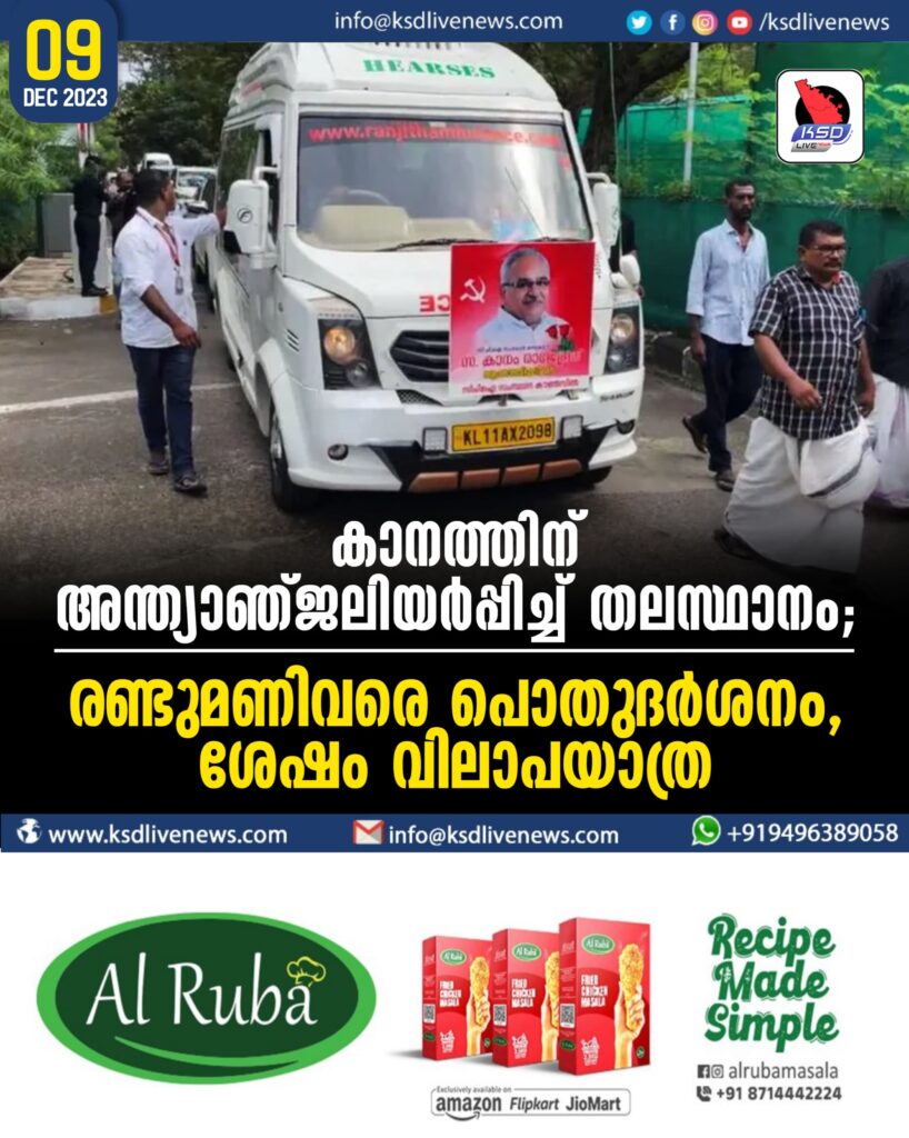 തിരുവനന്തപുരത്തു നിന്ന് ഉച്ചയ്ക്ക് രണ്ടിനു ശേഷം ഭൗതികശരീരം വിലാപയാത്രയായി കോട്ടയത്തേക്ക് കൊണ്ടുപോകും. വൈകുന്നേരം കോട്ടയം ജില്ലാകമ്മിറ്റി ഓഫീസില് പൊതുദര്ശനത്തിനു ശേഷമാകും മൃതദേഹം കാനത്തെ വീട്ടിലെത്തിക്കുക. ഞായറാഴ്ച രാവിലെ 10 മണിക്കാണ് സംസ്കാരം. സിപിഐയുടെയും എല്.ഡി.എഫിന്റെയും നേതാക്കളെല്ലാം തിരുവനന്തപുരത്തും കോട്ടയത്തുമായി പൊതുദര്ശനത്തിനെത്തിച്ചേരുമെന്ന് മന്ത്രി ജി.ആർ. അനിൽ പറഞ്ഞു.
