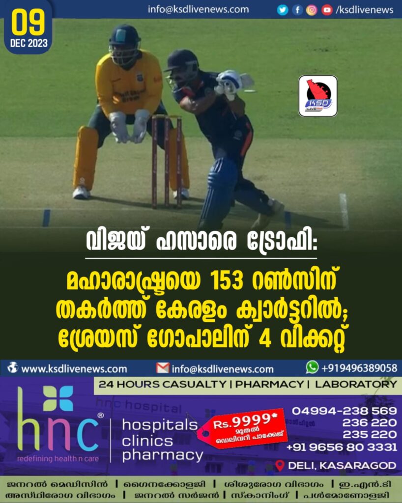 വിജയ് ഹസാരെ ട്രോഫി: മഹാരാഷ്ട്രയെ 153 റൺസിന് തകർത്ത് കേരളം ക്വാർട്ടറിൽ; ശ്രേയസ് ഗോപാലിന് 4 വിക്കറ്റ്