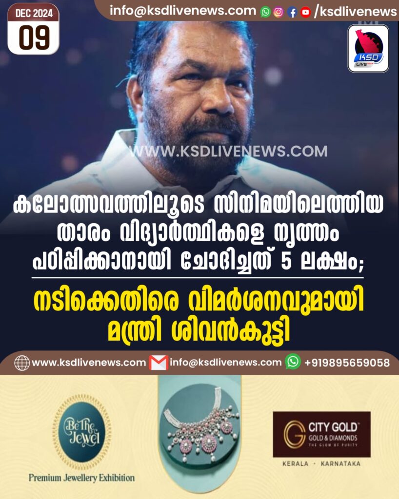 കലോത്സവത്തിലൂടെ സിനിമയിലെത്തിയ താരം വിദ്യാര്ത്ഥികളെ നൃത്തം പഠിപ്പിക്കാനായി ചോദിച്ചത് 5 ലക്ഷം; നടിക്കെതിരെ വിമര്ശനവുമായി മന്ത്രി ശിവൻകുട്ടി