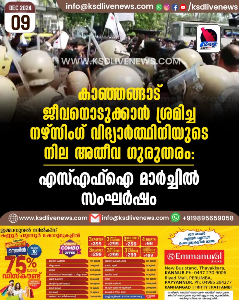 കാഞ്ഞങ്ങാട് ജീവനൊടുക്കാൻ ശ്രമിച്ച നഴ്സിംഗ് വിദ്യാർത്ഥിനിയുടെ നില അതീവ ഗുരുതരം; എസ്എഫ്ഐ മാർച്ചിൽ സംഘർഷം