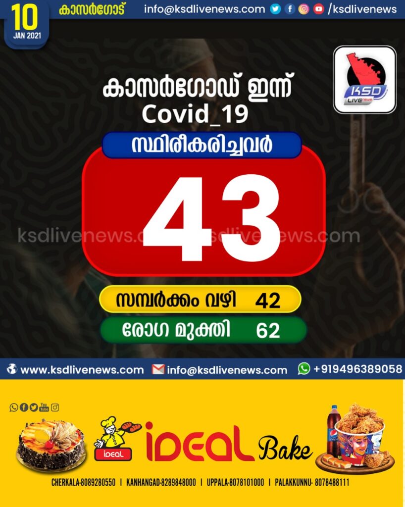കാസര്കോട് ജില്ലയില് 43 പേര്ക്ക് കോവിഡ്, 62 പേര്ക്ക് രോഗമുക്തി