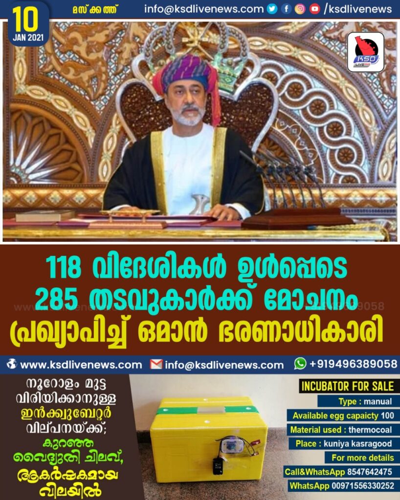 118 വിദേശികൾ ഉൾപ്പെടെ 285 തടവുകാർക്ക് മോചനം പ്രഖ്യാപിച്ച് ഒമാൻ ഭരണാധികാരിSHARE THIS ONബിൻ താരിക് ഒമാനിൽ അധികാരമേറ്റതിന്റെ ആദ്യ വാർഷികത്തോടനുബന്ധിച്ചാണ് തടവുകാർക്ക് മോചനം പ്രഖ്യാപിച്ചത്
