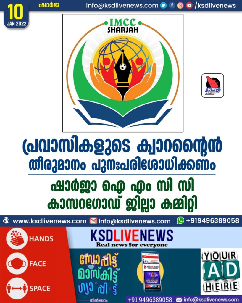 പ്രവാസികളുടെ ക്വാറൻ്റൈൻ , തീരുമാനം പുനഃപരിശോധിക്കണം ഷാർജാ : ഐ എം സി സി കാസറഗോഡ് ജില്ലാ കമ്മിറ്റി