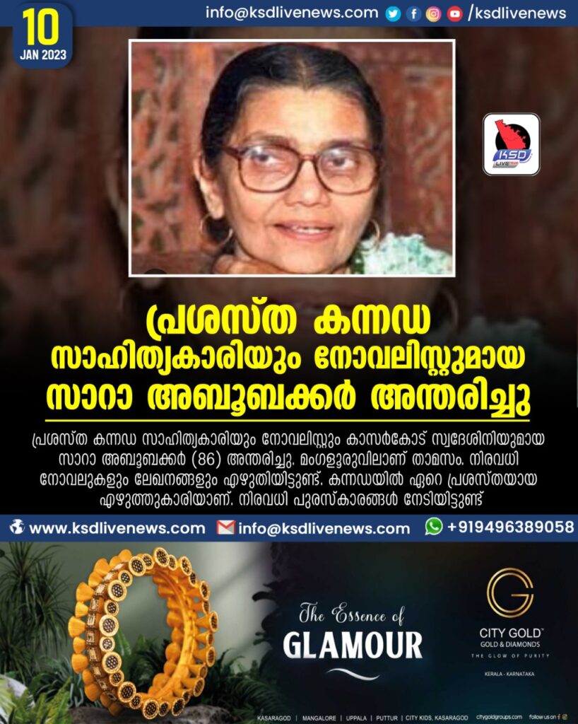 പ്രശസ്ത കന്നഡ സാഹിത്യകാരിയും നോവലിസ്റ്റുമായ സാറാ അബൂബക്കര് അന്തരിച്ചു
