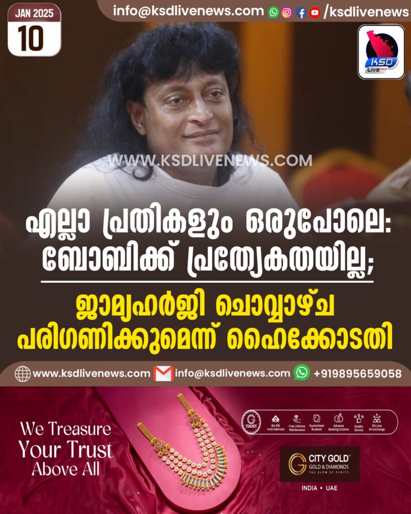 എല്ലാ പ്രതികളും ഒരുപോലെ: ബോബിക്ക് പ്രത്യേകതയില്ല; ജാമ്യഹര്ജി ചൊവ്വാഴ്ച പരിഗണിക്കുമെന്ന് ഹൈക്കോടതി