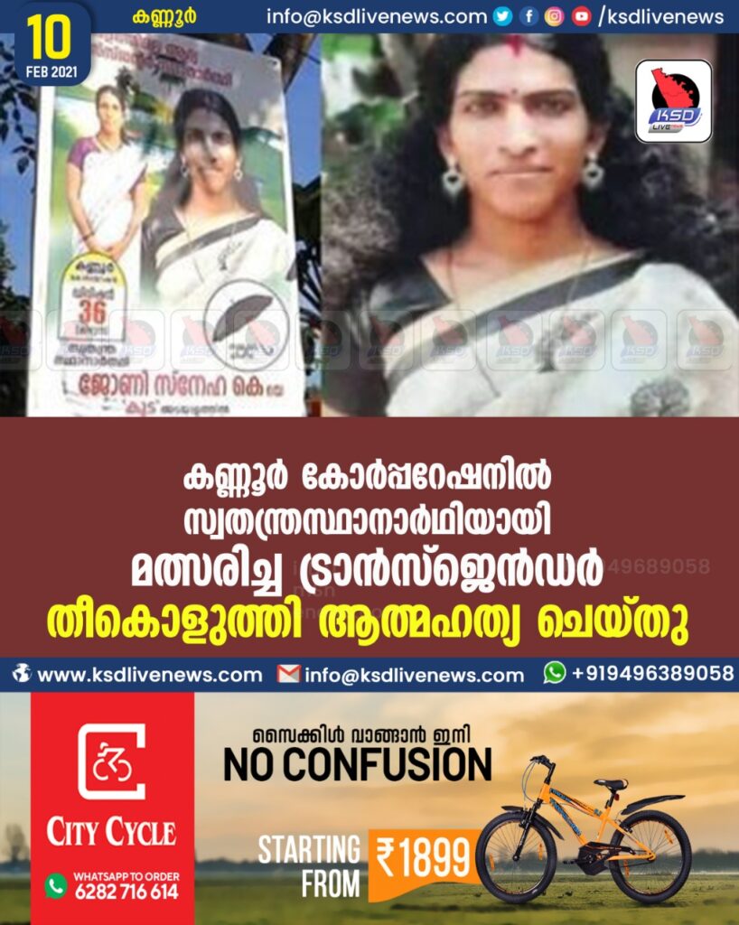 ര്‍പ്പറേഷനിലെ 36ാം ഡിവിഷനില്‍ സ്വതന്ത്രസ്ഥാനാര്‍ഥിയായി മത്സരിച്ചിരുന്ന ട്രാന്‍സ്ജെന്‍ഡര്‍ തീകൊളുത്തി ആത്മഹത്യ ചെയ്തു. തോട്ടട സമാജ് വാദി കോളനിയിലെ താമസക്കാരിയായ കെ സ്നേഹ(38) ആണ് മരിച്ചത്. ചൊവ്വാഴ്ച വൈകിട്ട് വീട്ടിനകത്താണ് സ്നേഹ ദേഹത്ത് മണ്ണെണ്ണയൊഴിച്ച് തീകൊളുത്തിയത്. ഗുരുതരമായി പൊള്ളലേറ്റ സ്നേഹയെ ഉടന്‍ തന്നെ കണ്ണൂര്‍ ഗവ. മെഡിക്കല്‍ കോളേജില്‍ പ്രവേശിപ്പിച്ചെങ്കിലും രാത്രിയോടെ മരണം സംഭവിച്ചു.