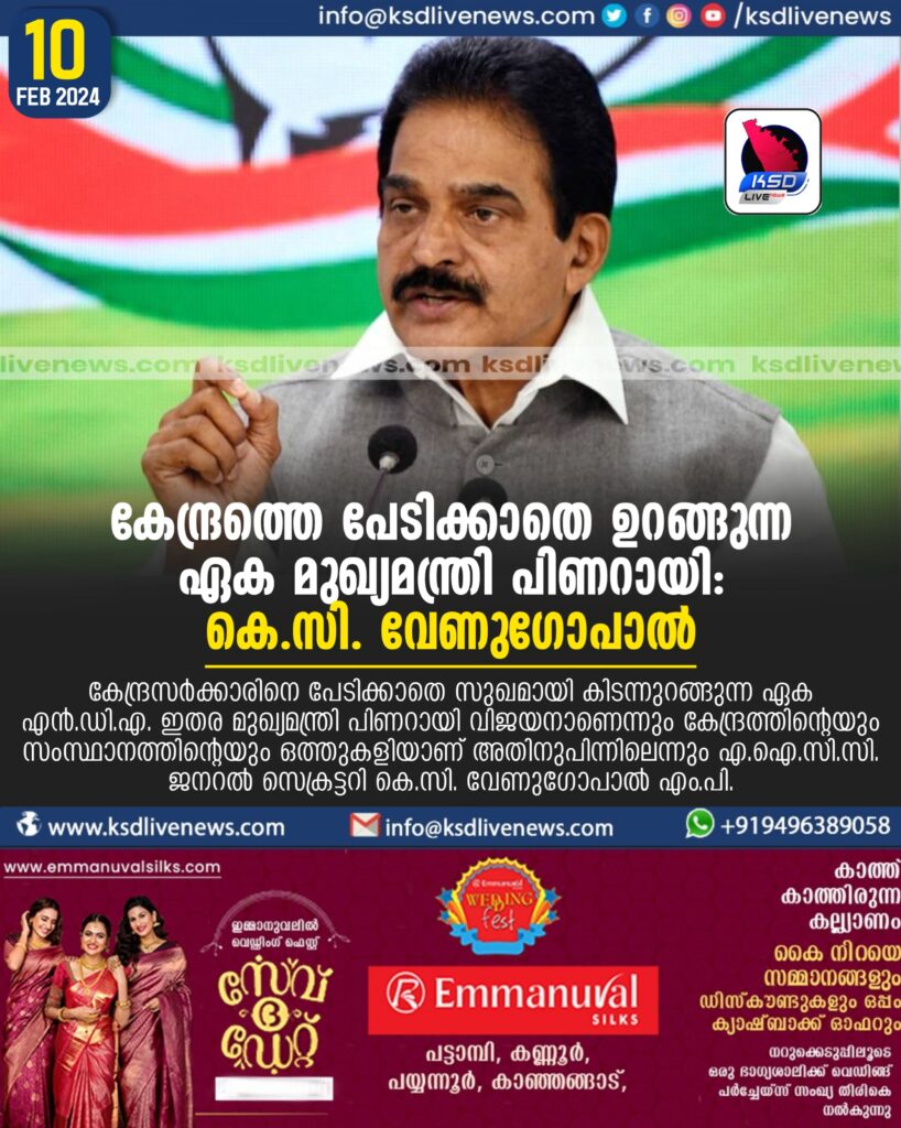 കേന്ദ്രത്തെ പേടിക്കാതെ ഉറങ്ങുന്ന ഏക മുഖ്യമന്ത്രി പിണറായി -കെ.സി. വേണുഗോപാൽ