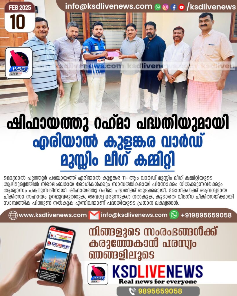 എരിയാൽ: മൊഗ്രാൽ പുത്തൂർ പഞ്ചായത്ത് എരിയാൽ കുളങ്കര 11-ആം വാർഡ് മുസ്ലിം ലീഗ് കമ്മിറ്റിയുടെ ആഭിമുഖ്യത്തിൽ നിരാലംബരായ രോഗികൾക്കും സാമ്പത്തികമായി പിന്നോക്കം നിൽക്കുന്നവർക്കും ആശ്വാസം പകരുന്നതിനായി ഷിഫായത്തു റഹ്മാ പദ്ധതിക്ക് തുടക്കമായി. രോഗികൾക്ക് ആവശ്യമായ ചികിത്സാ സഹായം ഉറപ്പുവരുത്തുക, അവശ്യ മരുന്നുകൾ നൽകുക, കൂടാതെ വിദഗ്ധ ചികിത്സയ്ക്കായി സാമ്പത്തിക പിന്തുണ നൽകുക എന്നിവയാണ് പദ്ധതിയുടെ പ്രധാന ലക്ഷ്യങ്ങൾ.