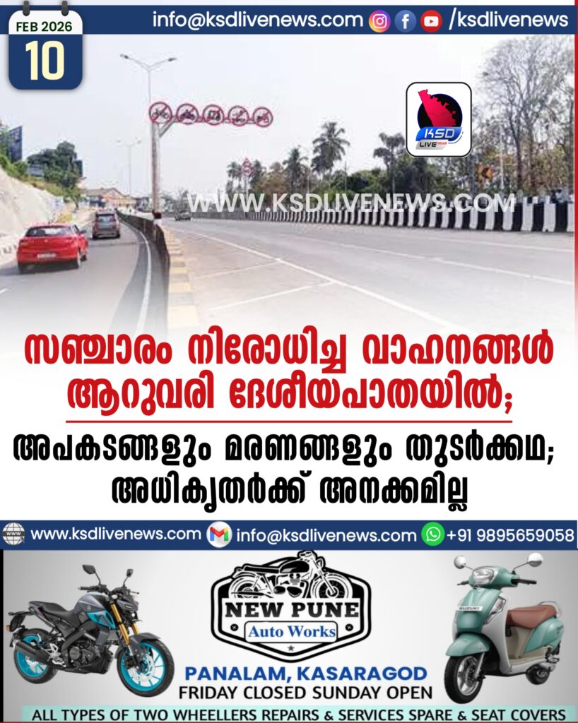 കുമ്പള : ദേശീയപാത 66 തലപ്പാടി-ചെങ്കള റീച്ച് പൂർത്തിയായി വാഹനങ്ങൾ മിന്നൽവേഗത്തിൽ പായുമ്പോഴും സഞ്ചാരം നിരോധിച്ച വാഹനങ്ങൾ പാതയിൽ നിരവധി. ദേശീയപാതയിൽ അപകടങ്ങൾ വർധിക്കുകയും വാഹനയാത്രക്കാരുടെ ജീവൻ നഷ്ടപ്പെടുമ്പോഴും ആർടിഒ, പോലീസ് അധികൃതർക്ക് ഒരു അനക്കവുമില്ല. കഴിഞ്ഞ ശനിയാഴ്ച രാത്രിയിലാണ് ദേശീയപാത കുമ്പള ആരിക്കാടിയിൽ ഇരുചക്രവാഹനയാത്രക്കാരൻ കാർ ഇടിച്ചതിനെ തുടർന്ന് മരിച്ചത്. ഇത്തരത്തിൽ ഒട്ടേറെപ്പേരുടെ വിലപ്പെട്ട ജീവൻ ദേശീയപാതയിലെ അപകടങ്ങളിൽ പൊലിഞ്ഞിട്ടുണ്ട്.