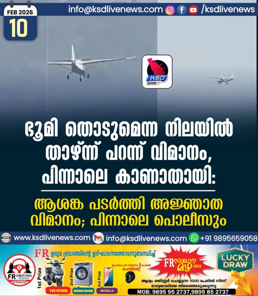 ഭൂമി തൊടുമെന്ന നിലയില് താഴ്ന്ന് പറന്ന് വിമാനം, പിന്നാലെ കാണാതായി, ആശങ്ക പടര്ത്തി അജ്ഞാത വിമാനം, പിന്നാലെ പൊലീസും