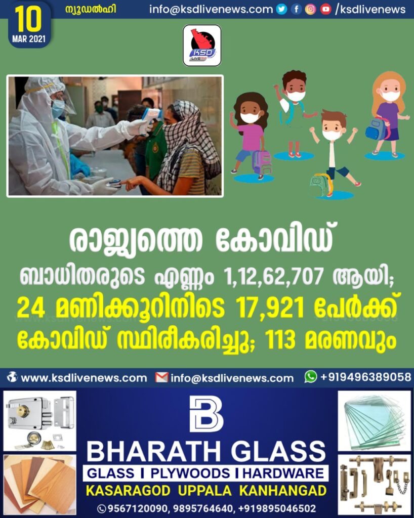രാജ്യത്തെ കോവിഡ് ബാധിതരുടെ എണ്ണം 1,12,62,707 കടന്നു ;