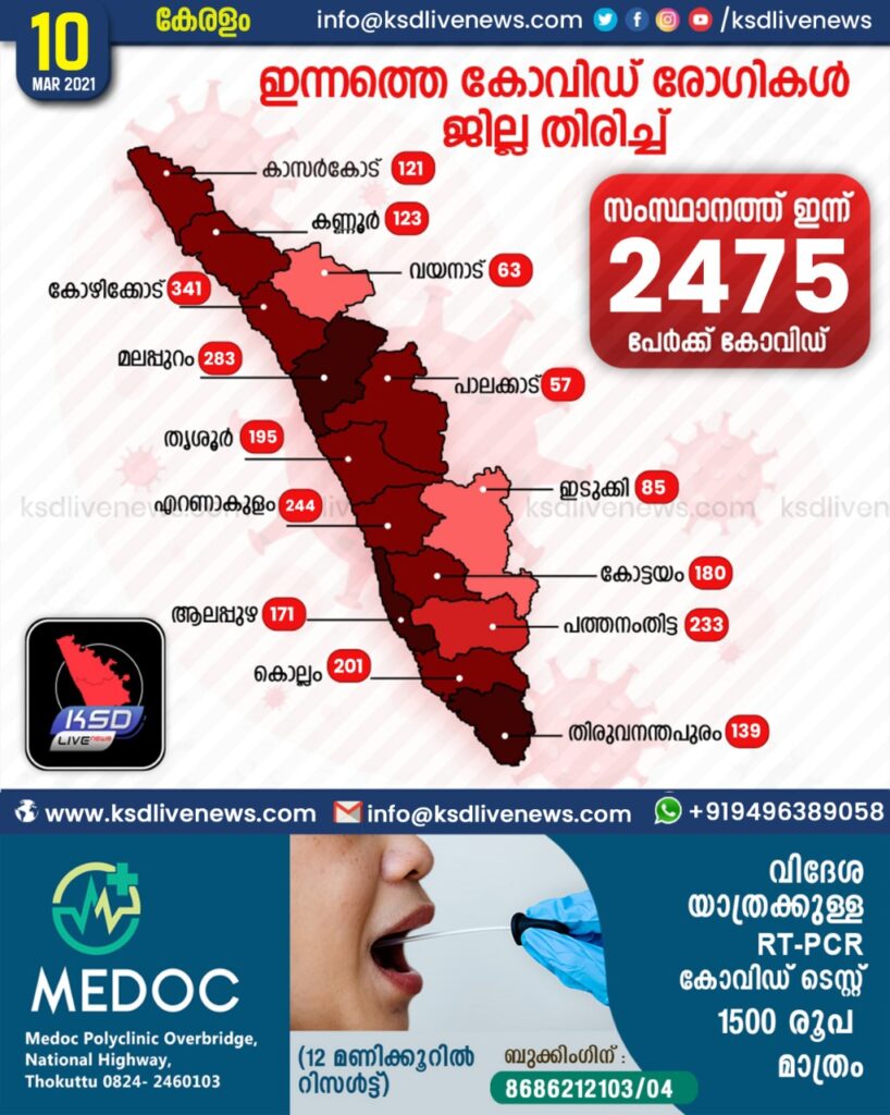 സംസ്ഥാനത്ത് ഇന്ന് 2475 പേര്ക്ക് കോവിഡ്-19 സ്ഥിരീകരിച്ചു. കോഴിക്കോട് 341, മലപ്പുറം 283, എറണാകുളം 244, പത്തനംതിട്ട 233, കൊല്ലം 201, തൃശൂര് 195, കോട്ടയം 180, തിരുവനന്തപുരം 178, ആലപ്പുഴ 171, കണ്ണൂര് 123, കാസര്ഗോഡ് 121, ഇടുക്കി 85, വയനാട് 63, പാലക്കാട് 57 എന്നിങ്ങനേയാണ് ജില്ലകളില് ഇന്ന് രോഗ ബാധ സ്ഥിരീകരിച്ചത്.