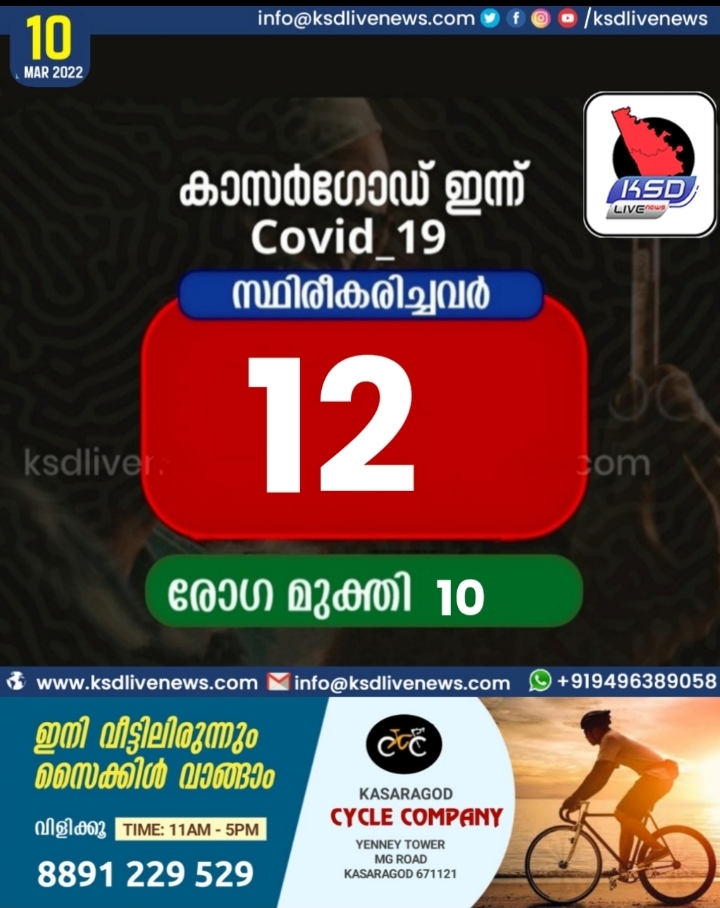 കാസർഗോഡ് ജില്ലയിൽ ഇന്ന് 12 പേർക്ക് കോവിഡ് സ്ഥിരീകരിച്ചു. 10 പേർക്ക് രോഗമുക്തി