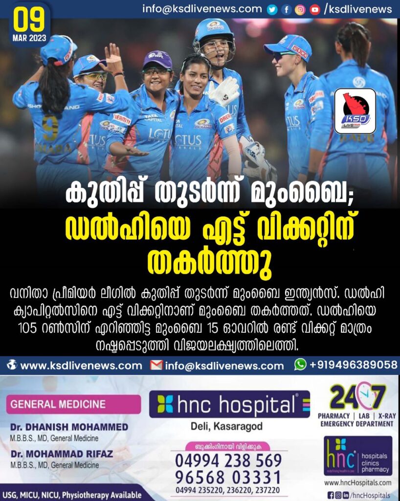 കുതിപ്പ് തുടര്ന്ന് മുംബൈ; ഡല്ഹിയെ എട്ട് വിക്കറ്റിന് തകര്ത്തു