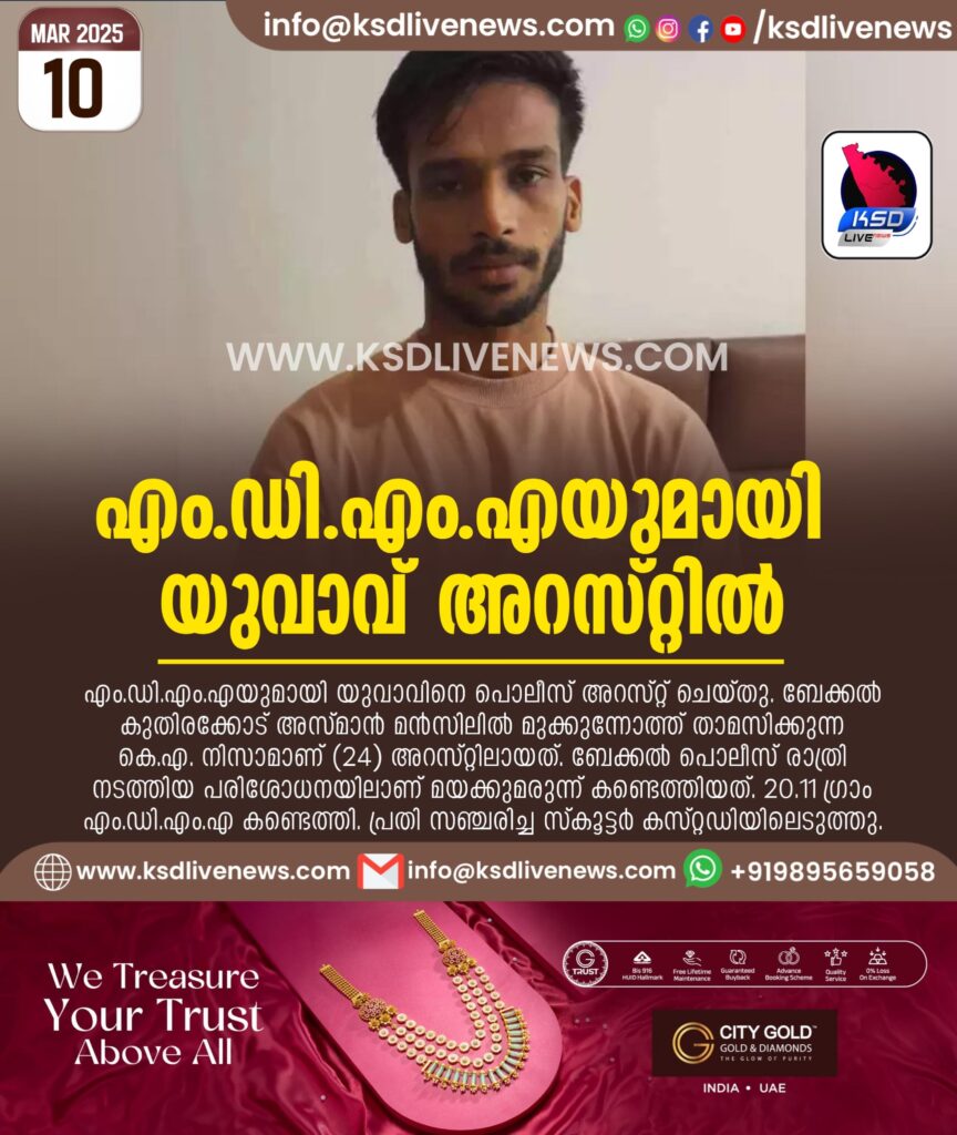കാഞ്ഞങ്ങാട്: എം.ഡി.എം.എയുമായി യുവാവിനെ പൊലീസ് അറസ്റ്റ് ചെയ്തു. ബേക്കൽ കുതിരക്കോട് അസ്മാൻ മൻസിലിൽ മുക്കുന്നോത്ത് താമസിക്കുന്ന കെ.എ. നിസാമാണ് (24) അറസ്റ്റിലായത്. ബേക്കൽ പൊലീസ് രാത്രി നടത്തിയ പരിശോധനയിലാണ് മയക്കുമരുന്ന് കണ്ടെത്തിയത്. 20.11 ഗ്രാം എം.ഡി.എം.എ കണ്ടെത്തി. പ്രതി സഞ്ചരിച്ച സ്കൂട്ടർ കസ്റ്റഡിയിലെടുത്തു. കാസർകോട് ഭാഗത്തുനിന്ന് ഓടിച്ചുവരുകയായിരുന്നു. ബേക്കൽ എസ്.ഐ സവ്യസാചി, പ്രബേഷൻ എസ്.ഐ എം.എൻ. മനുകൃഷ്ണൻ, ഹെഡ്ക്വാർട്ടേഴ്സിലെ സിവിൽ ഓഫിസർ അരുൺ കുമാർ, ഡ്രൈവർ എച്ച്. പ്രദീപ് എന്നിവർ ചേർന്നാണ് പ്രതിയെ പിടികൂടിയത്.