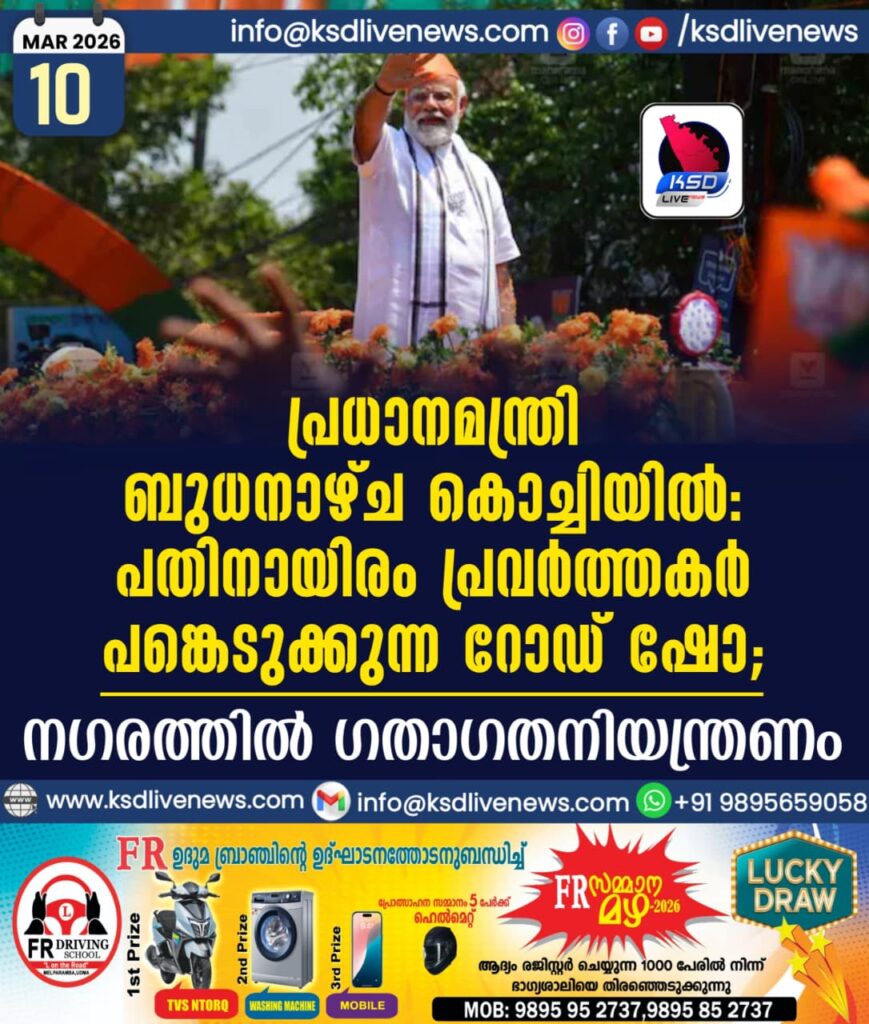 പ്രധാനമന്ത്രി ബുധനാഴ്ച കൊച്ചിയിൽ; പതിനായിരം പ്രവർത്തകർ പങ്കെടുക്കുന്ന റോഡ് ഷോ: നഗരത്തിൽ ഗതാഗതനിയന്ത്രണം