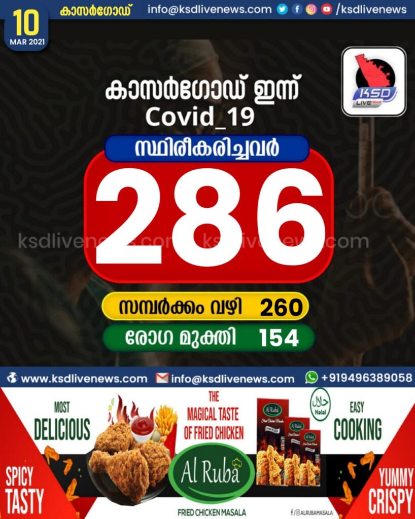 കാസർഗോഡ് ജില്ലയിൽ ഇന്ന് 286 പേർക്ക് കോവിഡ് സ്ഥിരീകരിച്ചു. സമ്പർക്കം വഴി 269 പേർക്കും. 154 പേർക്ക് രോഗമുക്തി