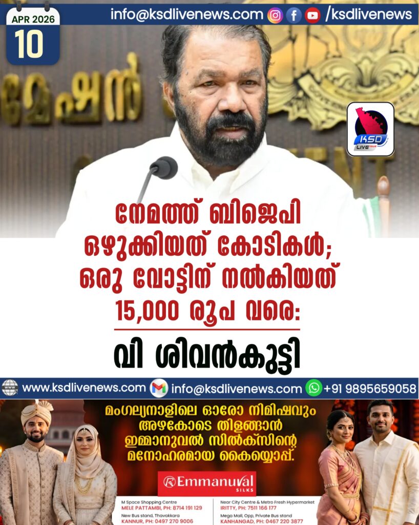 നേമത്ത് ബിജെപി ഒഴുക്കിയത് കോടികൾ; ഒരു വോട്ടിന് നൽകിയത് 15,000 രൂപ വരെ: വി ശിവൻകുട്ടി