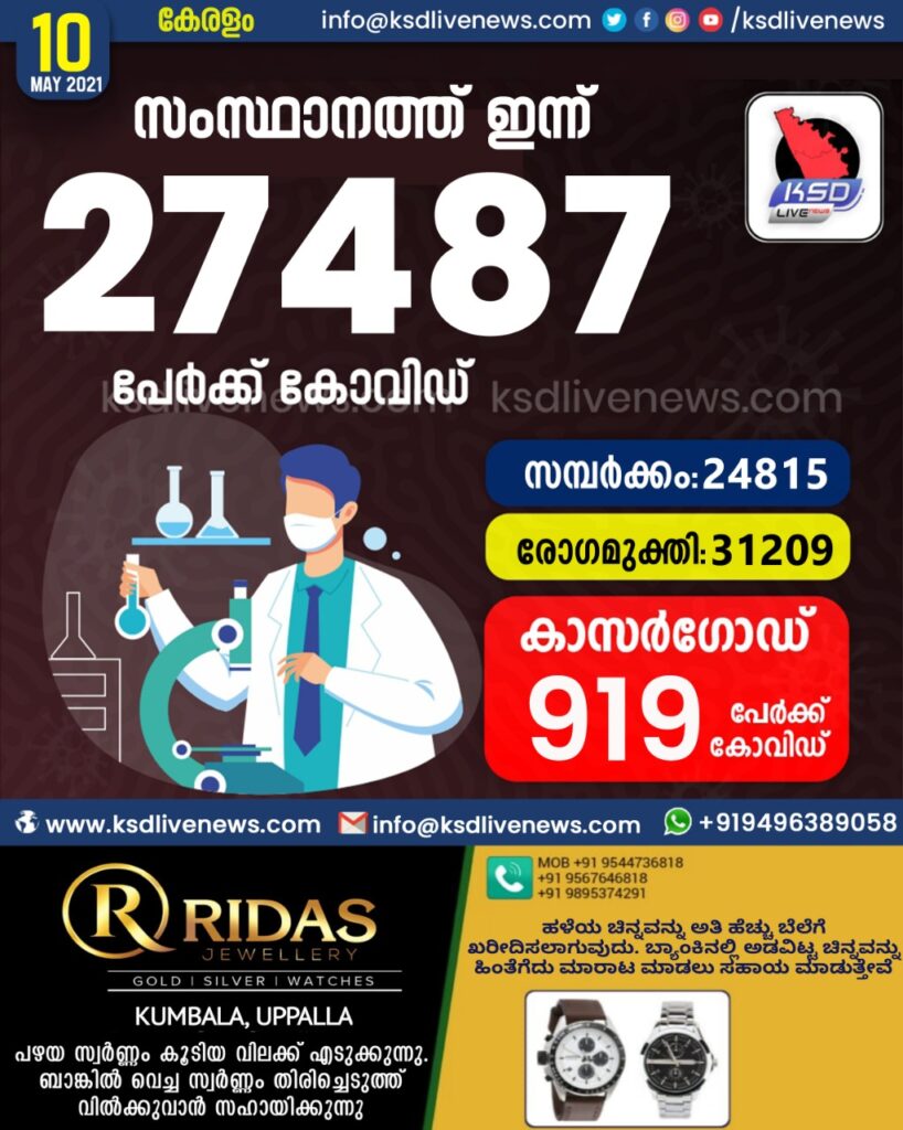 കോവിഡിൽ വിറച്ച് കേരളം ; സംസ്ഥാനത്ത് ഇന്ന് 27487 പേർക്ക് കോവിഡ് സ്ഥിരീകരിച്ചു. സമ്പർക്കം വഴി 24815 പേർക്കും ; ആശ്വാസമായി 31209 പേർക്ക് രോഗ മുക്തിയും ; കാസർഗോഡ് ജില്ലയിൽ 919 പേർക്ക് പുതിയ കോവിഡ് കേസുകൾ ; മരണം 65