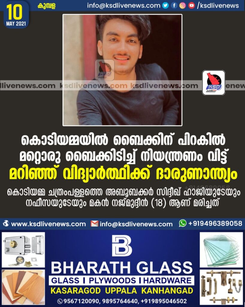 കൊടിയമ്മയിൽ ബൈക്കിന് പിറകില്‍ മറ്റൊരു ബൈക്കിടിച്ച് നിയന്ത്രണം വിട്ട് മറിഞ്ഞ് വിദ്യാര്‍ത്ഥിക്ക് ദാരുണാന്ത്യം