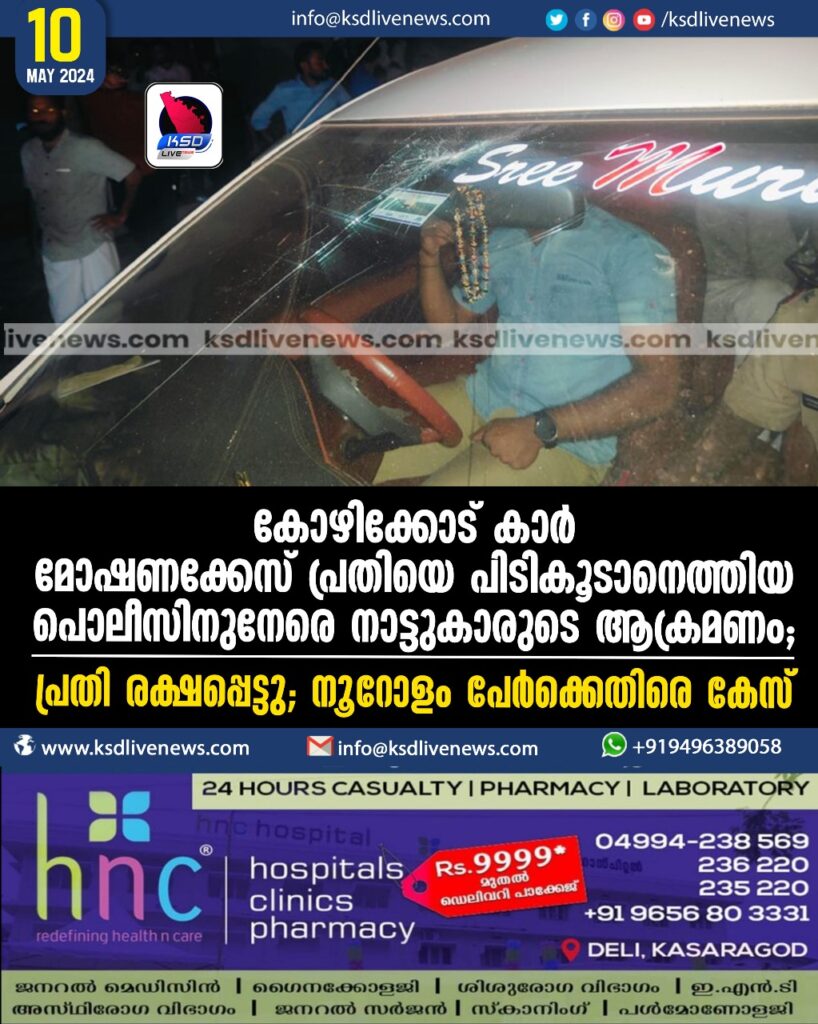കോഴിക്കോട് കാർ മോഷണക്കേസ് പ്രതിയെ പിടികൂടാനെത്തിയ പൊലീസിനുനേരെ നാട്ടുകാരുടെ ആക്രമണം; പ്രതി രക്ഷപ്പെട്ടു; നൂറോളം പേർക്കെതിരെ കേസ്