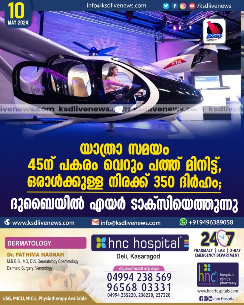 ദുബൈ: യാത്രാ സമയം 45 മിനിട്ടില് നിന്ന് 10 ആയി കുറച്ച് ഒരാള്ക്ക് 350 ദിർഹം നല്കി എയർ ടാക്സിയില് റൈഡ് പോകാം.
