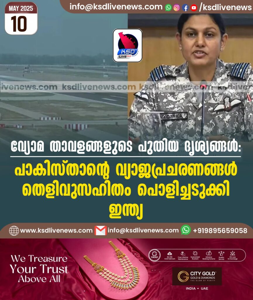 പാകിസ്താന്റെ പ്രചരണങ്ങള് കള്ളമാണെന്ന് തെളിയിക്കാനായി ഇന്ത്യയിലെ വ്യോമത്താവളങ്ങളുടെ ഏറ്റവും പുതിയ ദൃശ്യങ്ങളും വാര്ത്താസമ്മേളനത്തില് പങ്കുവെച്ചു. തീയതിയും സമയവുമെല്ലാം രേഖപ്പെടുത്തിയ ഏറ്റവും പുതിയ ദൃശ്യങ്ങളാണ് ഇന്ത്യ പുറത്തുവിട്ടത്. ഇന്ത്യയിലെ വ്യോമ താവളങ്ങളുടെ പ്രവര്ത്തനങ്ങളെല്ലാം സാധാരണനിലയില് തുടരുകയാണെന്നും വാര്ത്താസമ്മേളനത്തില് പങ്കെടുത്ത വിങ് കമാന്ഡര് വ്യോമിക സിങ് വ്യക്തമാക്കി.
