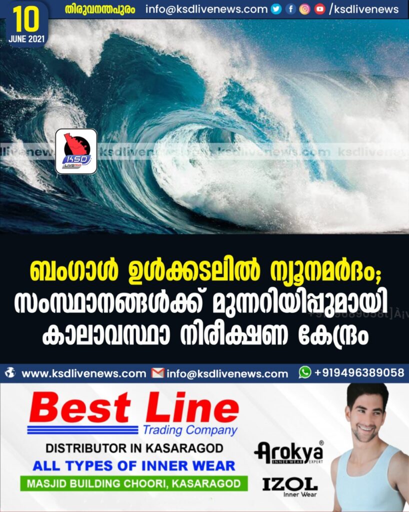 ന്യൂഡൽഹി : ബംഗാള്‍ ഉള്‍ക്കടലിലെ പുതിയ ന്യൂനമര്‍ദ്ദത്തെ തുടര്‍ന്ന് ജൂണ്‍ 10 മുതല്‍ കിഴക്കന്‍ സംസ്ഥാനങ്ങളില്‍ കനത്ത മഴ ലഭിക്കുമെന്ന് മുന്നറിയിപ്പുമായി കാലാവസ്ഥാ നിരീക്ഷണ കേന്ദ്രം. കേരള തീരത്ത് ജൂണ്‍ 10 രാത്രി 11.30 വരെ 2.5 മുതല്‍ 3.2 മീറ്റര്‍ വരെ ഉയരത്തില്‍ തിരമാലക്കും കടലാക്രമണത്തിനും സാധ്യതയുണ്ടെന്ന് ദേശീയ സമുദ്ര സ്ഥിതി പഠന ഗവേഷണ കേന്ദ്രം അറിയിച്ചു. യാതൊരു കാരണവശാലും കടലില്‍ പോകരുതെന്നും കടല്‍ക്ഷോഭം രൂക്ഷമാകാന്‍ സാധ്യതയുള്ളതിനാല്‍ അപകട മേഖലകളില്‍ നിന്ന് അധികൃതരുടെ നിര്‍ദേശാനുസരണം മാറി താമസിക്കണമെന്നും അറിയിപ്പിൽ പറയുന്നു. പശ്ചിമ ബംഗാള്‍, ഒഡിഷ, ബിഹാര്‍, ഝാര്‍ഖണ്ഡ്, ഛത്തീസ്ഗഡ്, സിക്കിം എന്നിവിടങ്ങളില്‍ തെക്കുപടിഞ്ഞാറന്‍ മണ്‍സൂണ്‍ ശക്തിപ്പെടാന്‍ ന്യൂനമര്‍ദം കാരണമാകുമെന്നും കാലാവസ്ഥാ നിരീക്ഷണ കേന്ദ്രം അറിയിച്ചു.