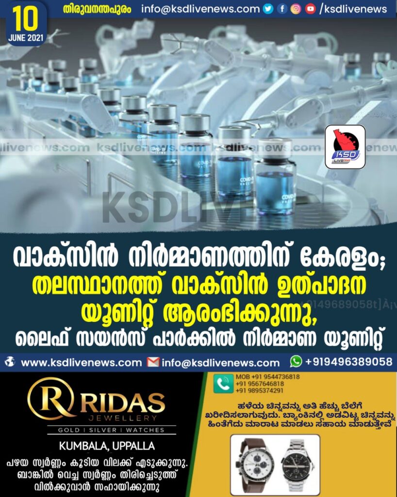 വാക്സിന് നിര്മ്മാണത്തിന് കേരളം: തലസ്ഥാനത്ത് വാക്സിന് ഉത്പാദന യൂണിറ്റ് ആരംഭിക്കുന്നു, ലൈഫ് സയന്സ് പാര്ക്കില് നിര്മ്മാണ യൂണിറ്റ്
