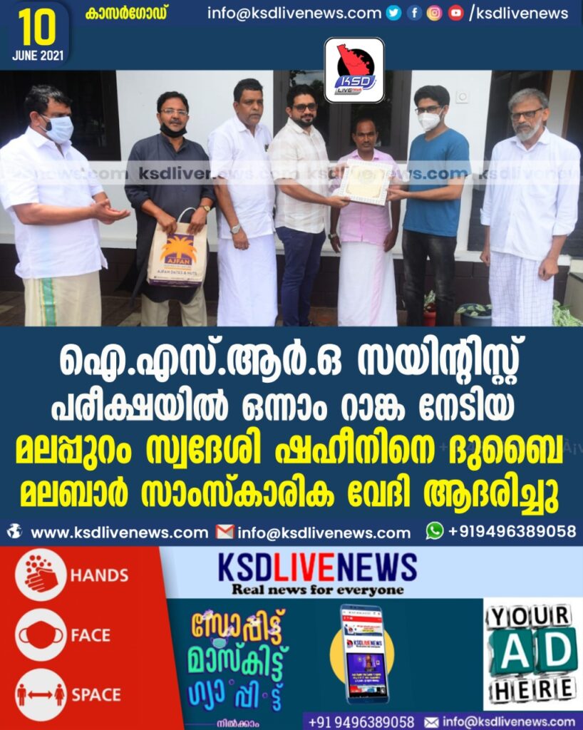 ഐ.എസ്.ആർ.ഒ സയിന്റിസ്റ്റ് പരീക്ഷയിൽ ഒന്നാം റാങ്ക് നേടിയ മലപ്പുറം സ്വദേശി ഷഹീനിനെ ദുബൈ മലബാർ സാംസ്കാരിക വേദി ആദരിച്ചു