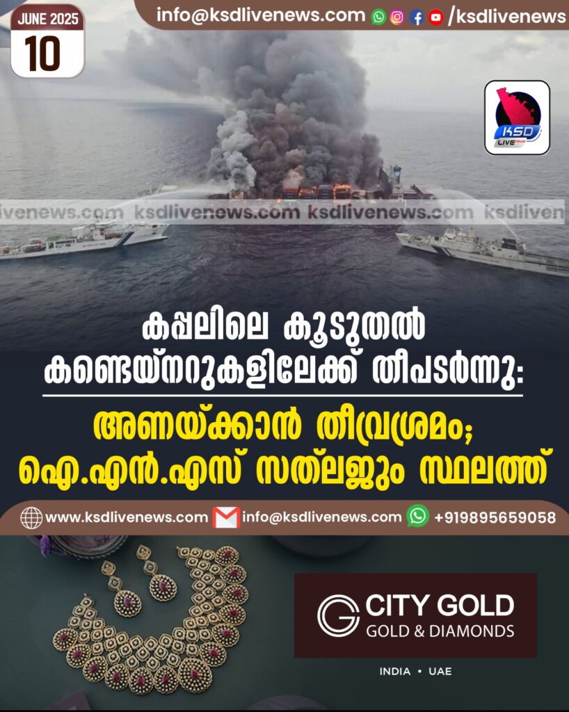 കപ്പലിലെ കൂടുതല് കണ്ടെയ്നറുകളിലേക്ക് തീപടര്ന്നു: അണയ്ക്കാന് തീവ്രശ്രമം; ഐ.എൻ.എസ് സത്ലജും സ്ഥലത്ത്