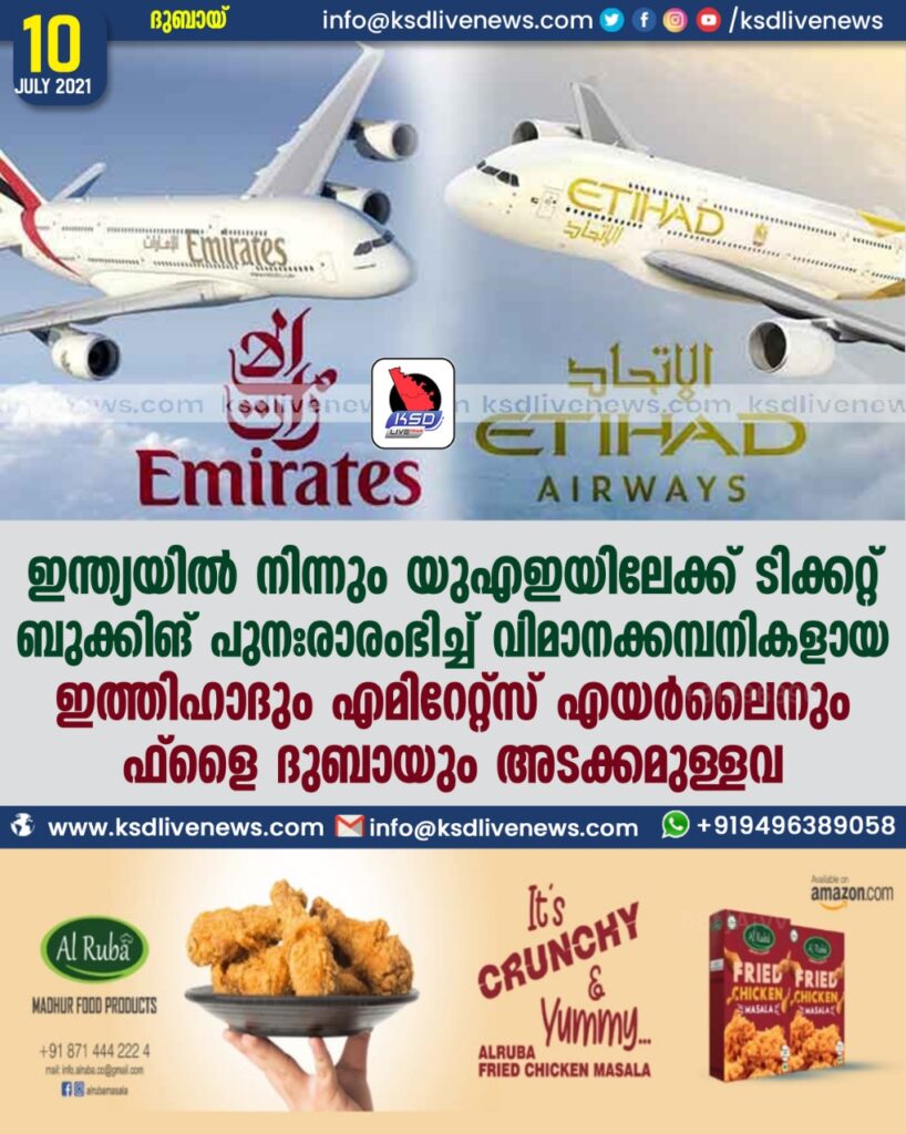 ഇന്ത്യയില്‍ നിന്നും യുഎഇയിലേക്ക് ടിക്കറ്റ് ബുക്കിങ് പുനഃരാരംഭിച്ച്‌ വിമാനക്കമ്പനികളായ ഇത്തിഹാദും എമിറേറ്റ്‌സ് എയര്‍ലൈനും ഫ്‌ളൈ ദുബായും അടക്കമുള്ളവ