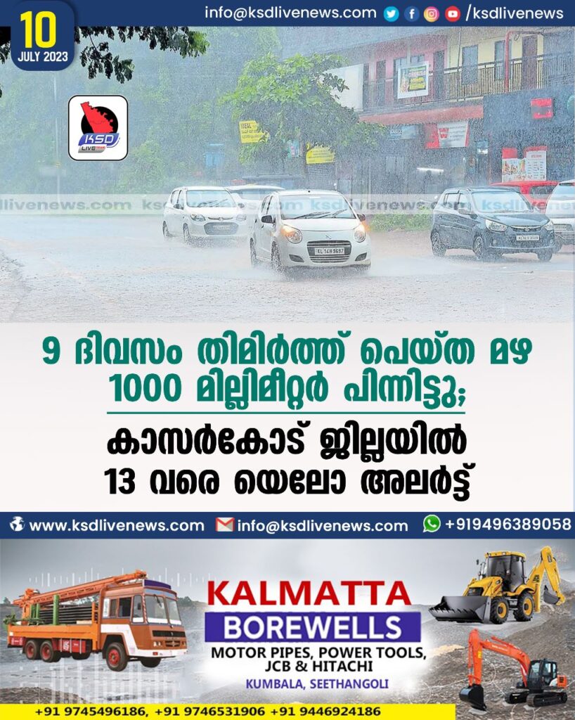 9 ദിവസം തിമിർത്ത് പെയ്ത മഴ 1000 മില്ലിമീറ്റർ പിന്നിട്ടു: കാസർകോട് ജില്ലയിൽ 13 വരെ യെലോ അലർട്ട്