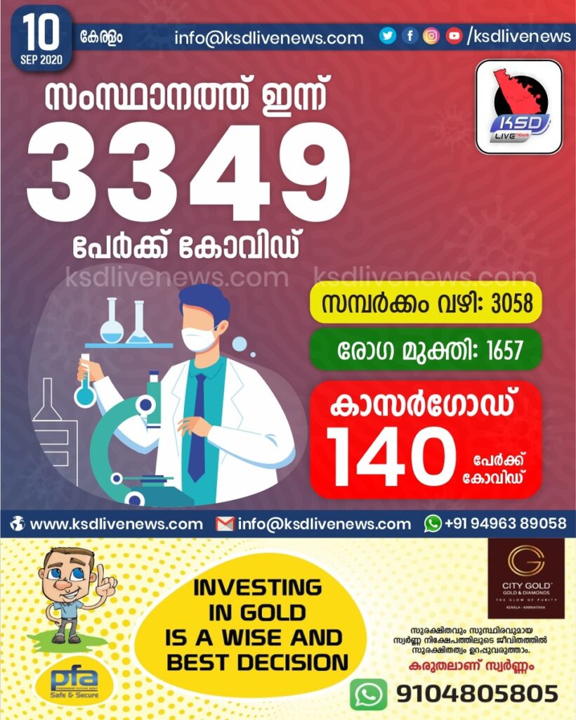 സംസ്ഥാനത്ത് ഇന്ന് 3349 പേർക്ക് കോവിഡ് സ്ഥിരീകരിച്ചു. സമ്പർക്കം വഴി 3058 പേർക്കും.രോഗ മുക്തി 1657 പേർക്കും. കാസർഗോഡ് ജില്ലയിൽ ഇന്ന് 140 പേർക്ക് കോവിഡ് സ്ഥിരീകരിച്ചു.
