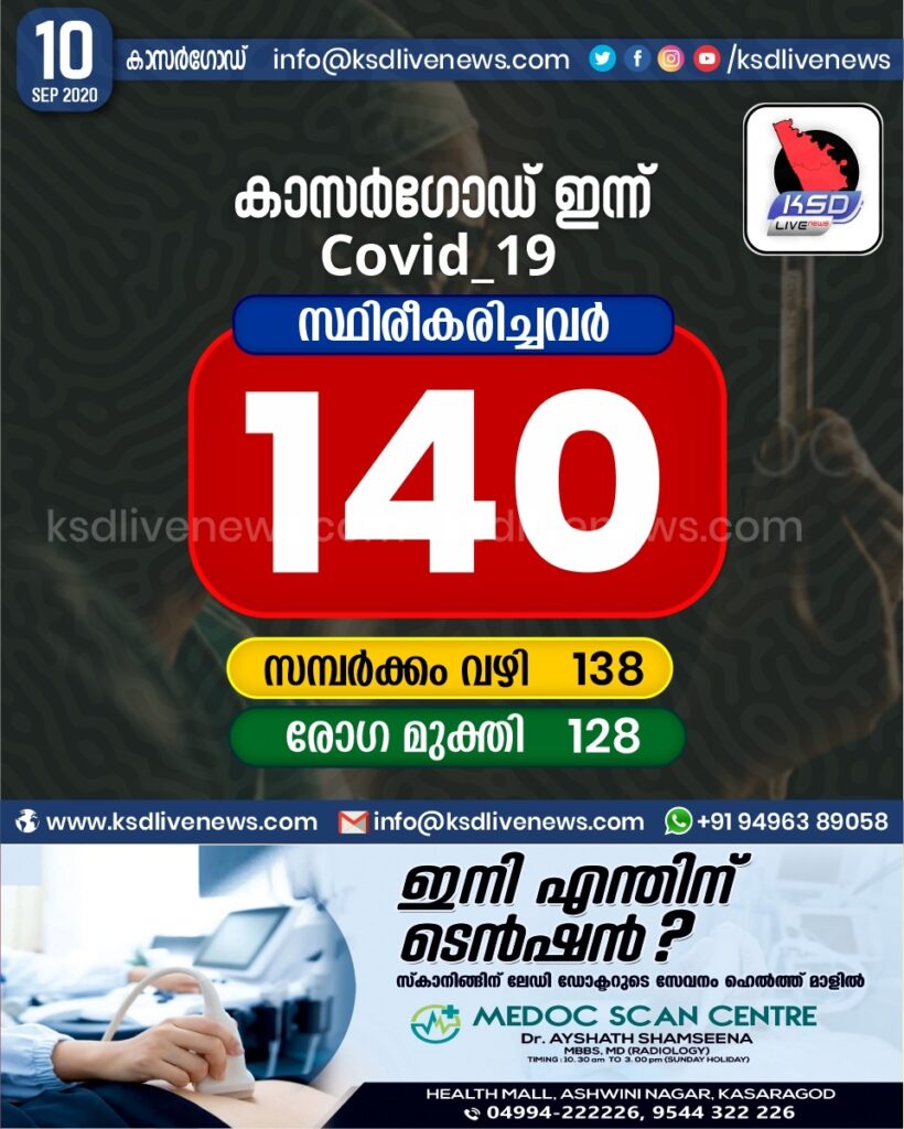 കാസർഗോഡ് ജില്ലയിൽ ഇന്ന് 140 പേർക്ക് കോവിഡ് സ്ഥിരീകരിച്ചു. സമ്പർക്കം വഴി 138 പേർക്കും. 128 പേർക്ക് രോഗ മുക്തി