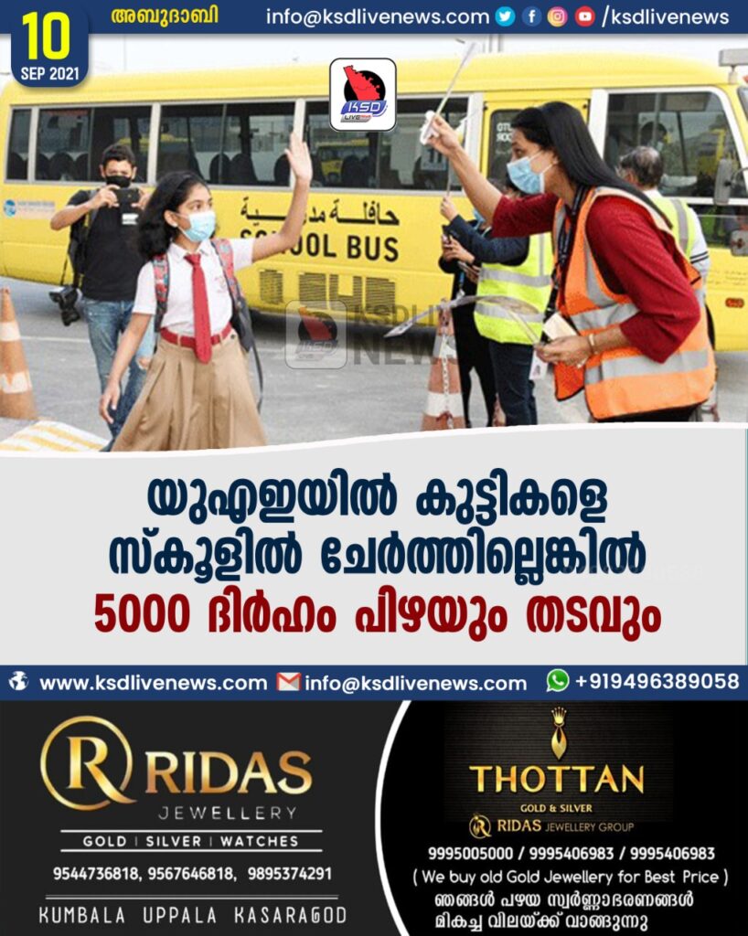 യുഎഇയില്‍ കുട്ടികളെ സ്‌കൂളില്‍ ചേര്‍ത്തില്ലെങ്കില്‍ 5000 ദിര്‍ഹം പിഴയും തടവും