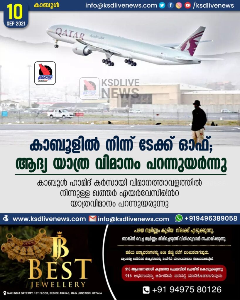 ദോഹ: അമേരിക്കൻ സൈനികർ പിൻവാങ്ങിയ ശേഷം അഫ്​ഗാനിലെ കാബൂൾ ഹാമിദ്​ കർസായി രാജ്യാന്തര വിമാനത്താവളത്തിൽ നിന്നും ആദ്യ യാത്ര വിമാനം പറന്നുയർന്നു. ഖത്തറി‍െൻറയും തുർക്കിയുടെയും സാ​ങ്കേതിക സംഘത്തി​നു കീഴിൽ വിമാനത്താവളം 90 ശതമാനവും പ്രവർത്തന സജ്ജമായി എന്ന റിപ്പോർട്ടിനു പിന്നാലെയാണ്​ വ്യാഴാഴ്​ച ഖത്തർ എയർവേസി‍െൻറ ആദ്യ യാത്ര വിമാനം കാബൂളിൽ നിന്നും ടേക്ക്​ ഓഫ്​ ചെയ്​തത്​. ഖത്തർ വിദേശകാര്യ മന്ത്രി ശൈഖ്​ മുഹമ്മദ്​ ബിൻ അബ്​ദുൽ റഹ്​മാൻ ആൽഥാനി​ ആദ്യ യാത്ര വിമാനം പറന്നുയർന്നതായി സ്​ഥിരീകരിച്ചു.