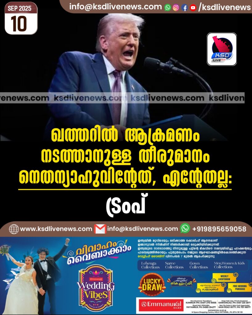 ഖത്തറിൽ ആക്രമണം നടത്താനുള്ള തീരുമാനം നെതന്യാഹുവിന്റേത്, എന്റേതല്ല: ട്രംപ്