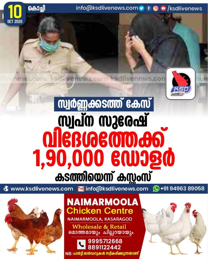 സ്വപ്ന സുരേഷ് വിദേശത്തേക്ക് 1,90,000 ഡോളര് കടത്തിയെന്ന് കസ്റ്റംസ്