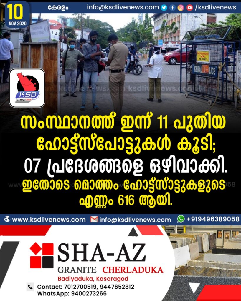 സംസ്ഥാനത്ത് ഇന്ന് 11 പുതിയ ഹോട്ട്സ്പോട്ടുകള് കൂടി; 07 പ്രദേശങ്ങളെ ഒഴിവാക്കി. ഇതോടെ മൊത്തം ഹോട്ട്സ്പോട്ടുകളുടെ എണ്ണം 616 ആയി.