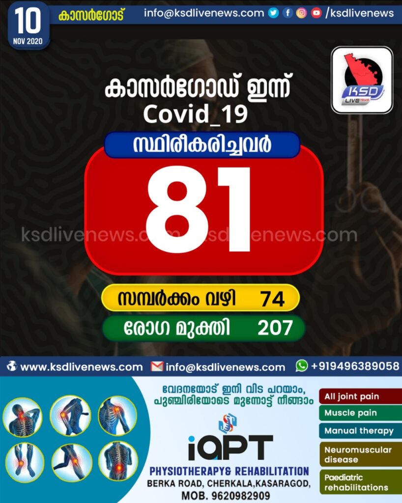 കാസർഗോഡ് ജില്ലയിൽ ഇന്ന് 81 പേർക്ക് കോവിഡ് സ്ഥിരീകരിച്ചു. സമ്പർക്കം വഴി 74 പേർക്കും. 207 പേർക്ക് രോഗമുക്തി
