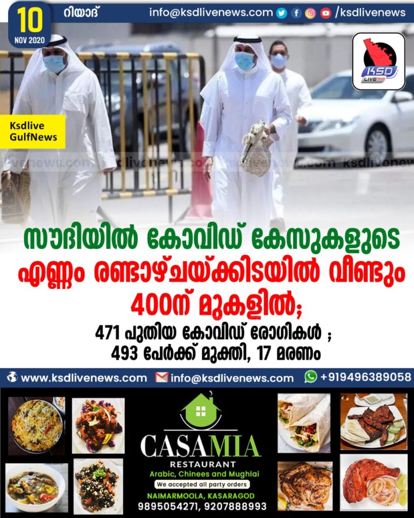 സൗദിയിൽ കോവിഡ് കേസുകളുടെ എണ്ണം രണ്ടാഴ്ചയ്ക്കിടയിൽ വീണ്ടും 400ന് മുകളിൽ ;