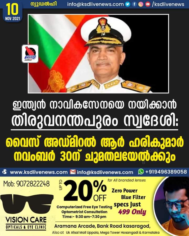 ഇന്ത്യൻ നാവികസേനയെ നയിക്കാൻ തിരുവനന്തപുരം സ്വദേശി: വൈസ് അഡ്മിറൽ ആർ ഹരികുമാർ നവംബർ 30-ന് ചുമതലയേൽക്കും