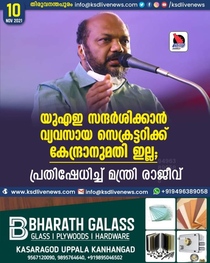 യുഎഇ സന്ദർശിക്കാന് വ്യവസായ സെക്രട്ടറിക്ക് കേന്ദ്രാനുമതി ഇല്ല; പ്രതിഷേധിച്ച് മന്ത്രി രാജീവ്